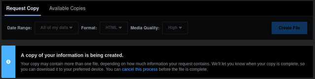 First, we need to obtain the messaging data. Few years ago I had to use some third-party scripts that would scroll through my messages and save them one by one. The technology (or more precisely, enforcement of GDPR) moves forward and now Facebook provides a nifty tool with which you can download the data directly. Go to facebook.com/dyi, select Messages, JSON format and press Create File. Depending on the amount of messages you have, it will take anywhere between half an hour and a day to receive the download link.
