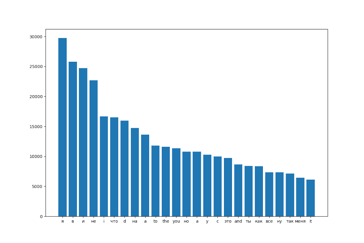 Since the content of the message is also included, you can even further and analyze the messages themselves. For example, we can count occurences of every word: